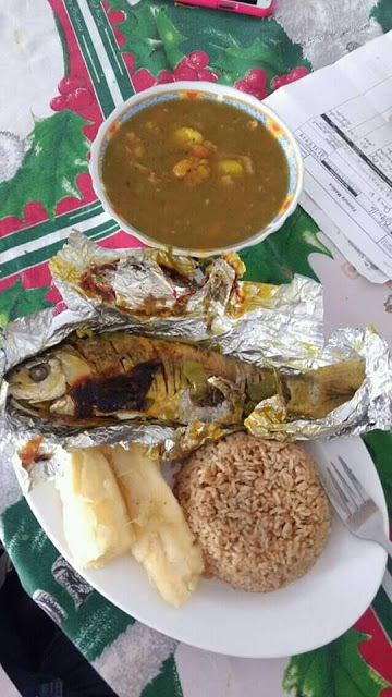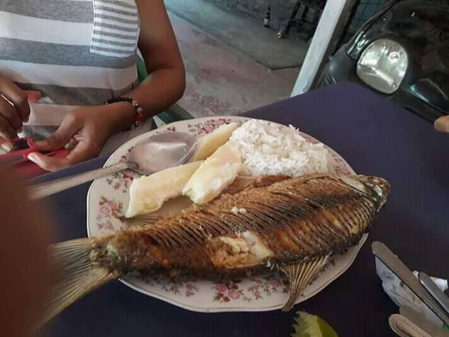 Arroz blanco, pescado frito y yuca cocida